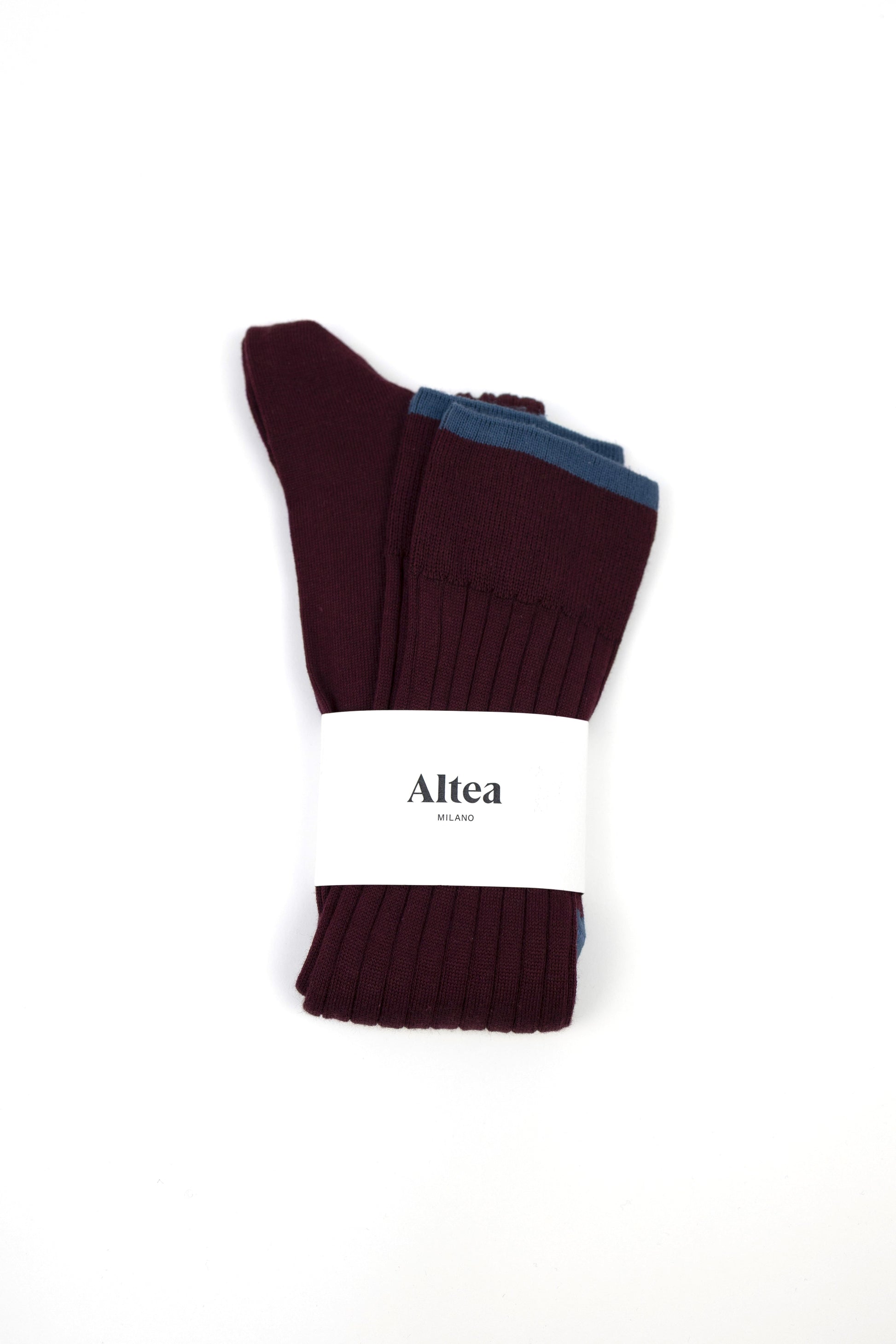Calza lunga a coste fondo bordeaux con contrasto azzurro.