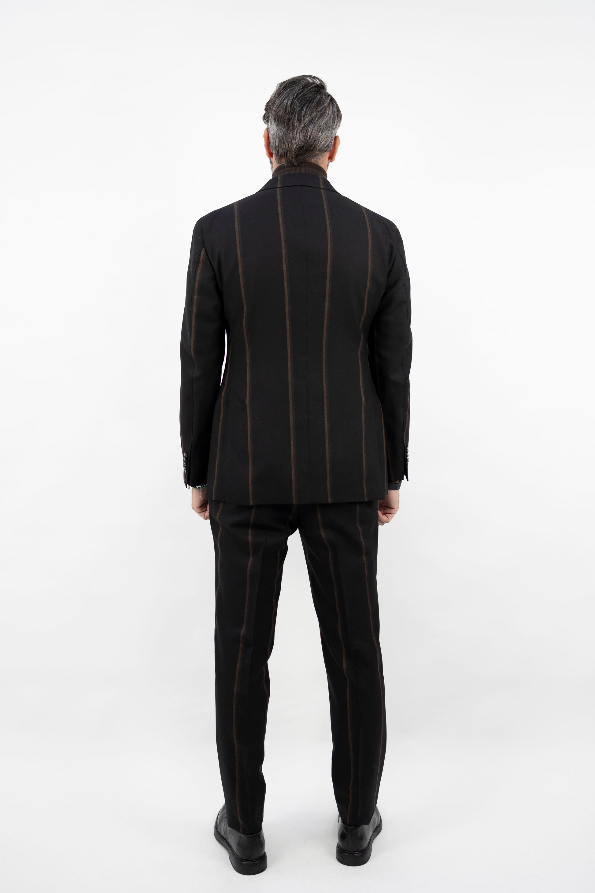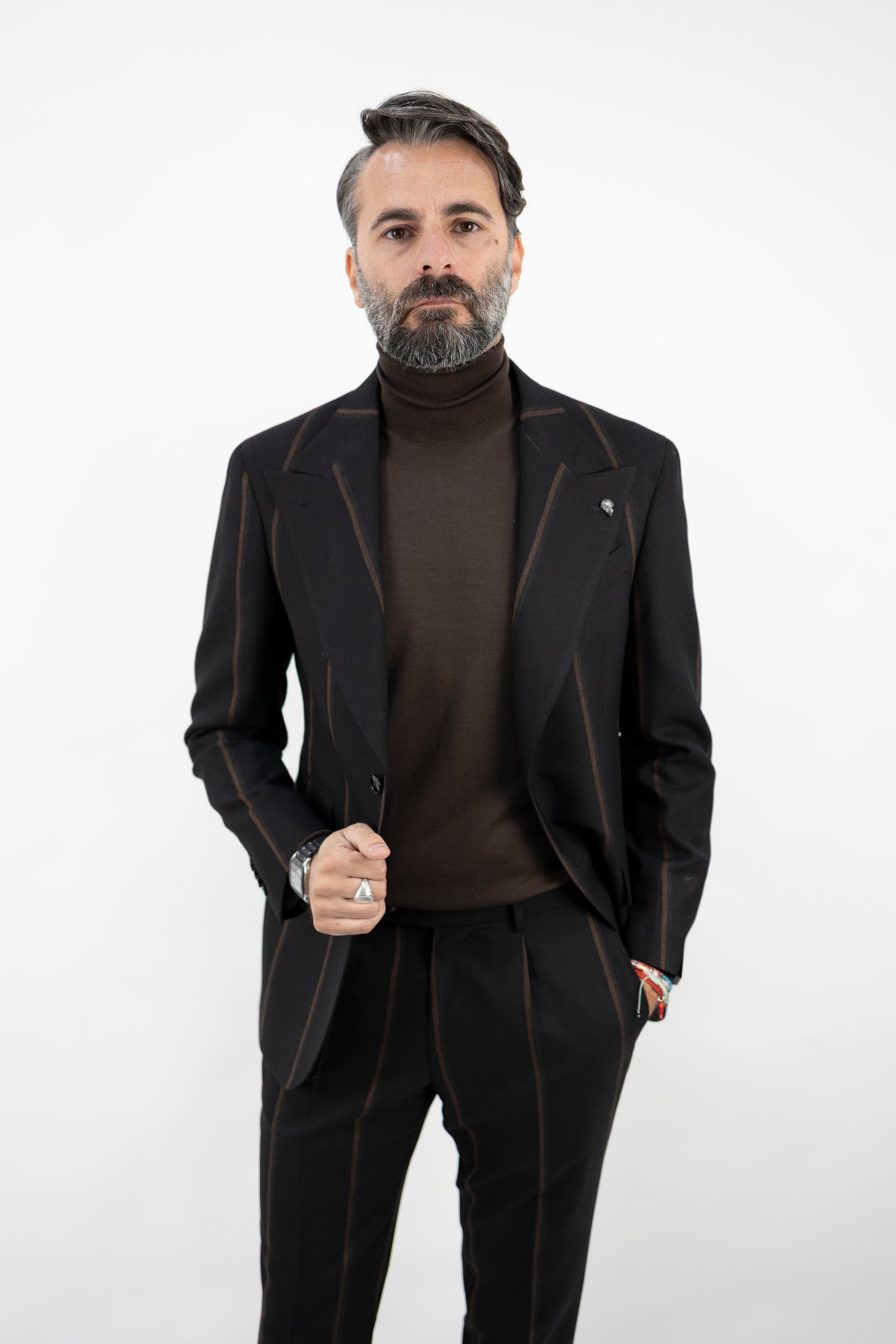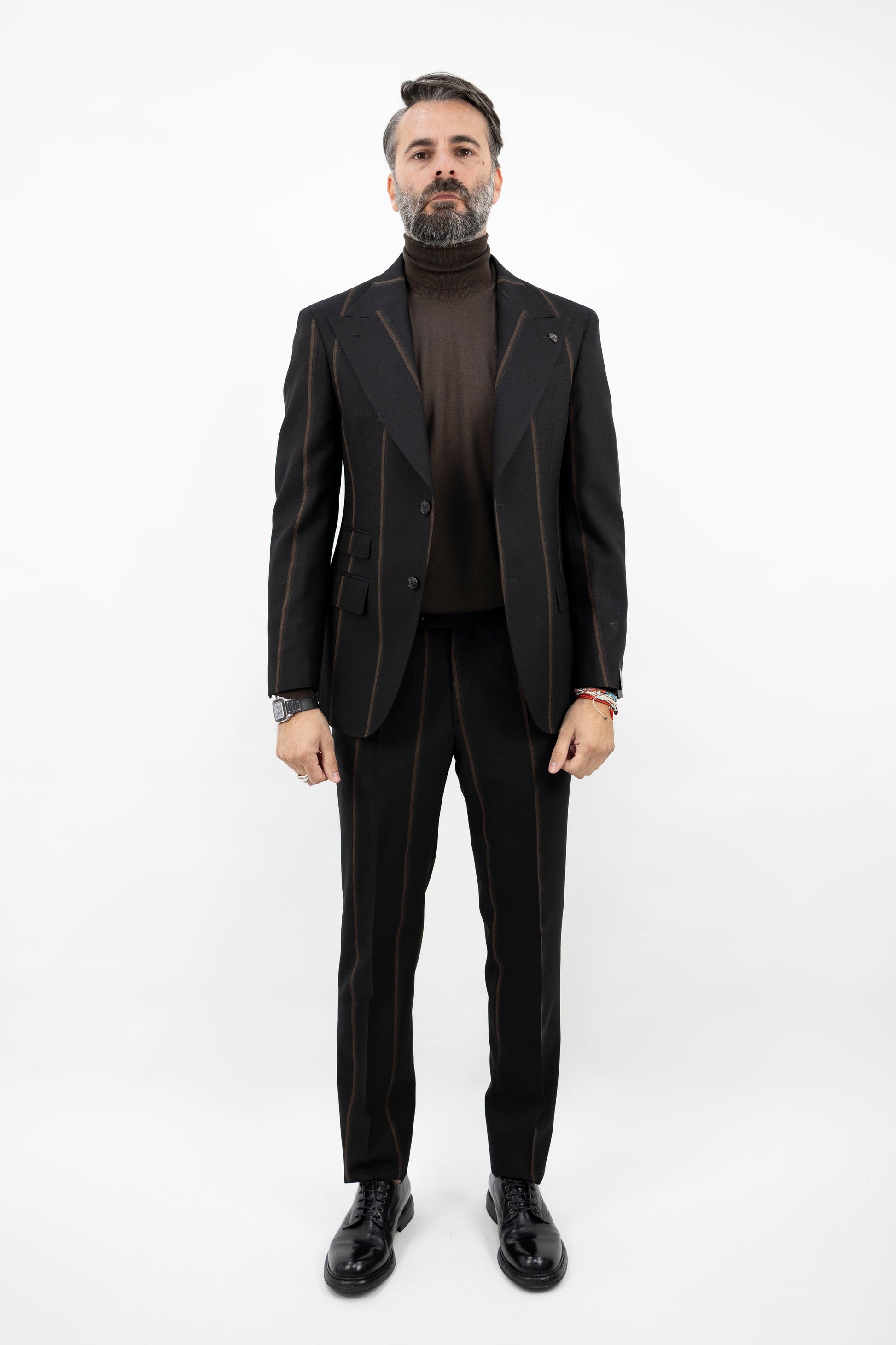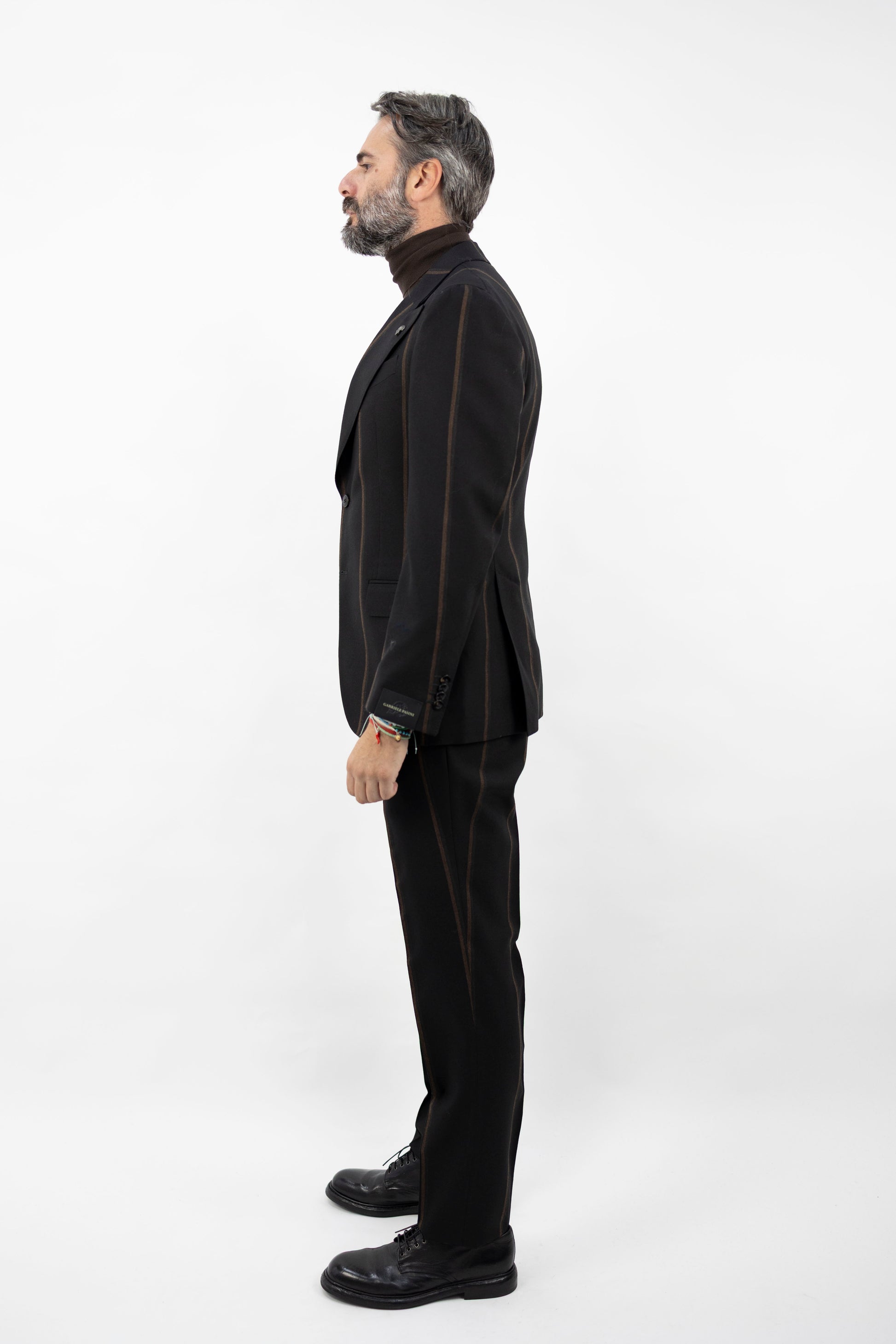 Abito nero con riga marrone. Giacca monopetto due bottoni in madreperla, revers a specchio con logo, tre tasche frontali con pattina, mezza fodera. Pantalone una pence, bustino classico con passanti, tasca america.