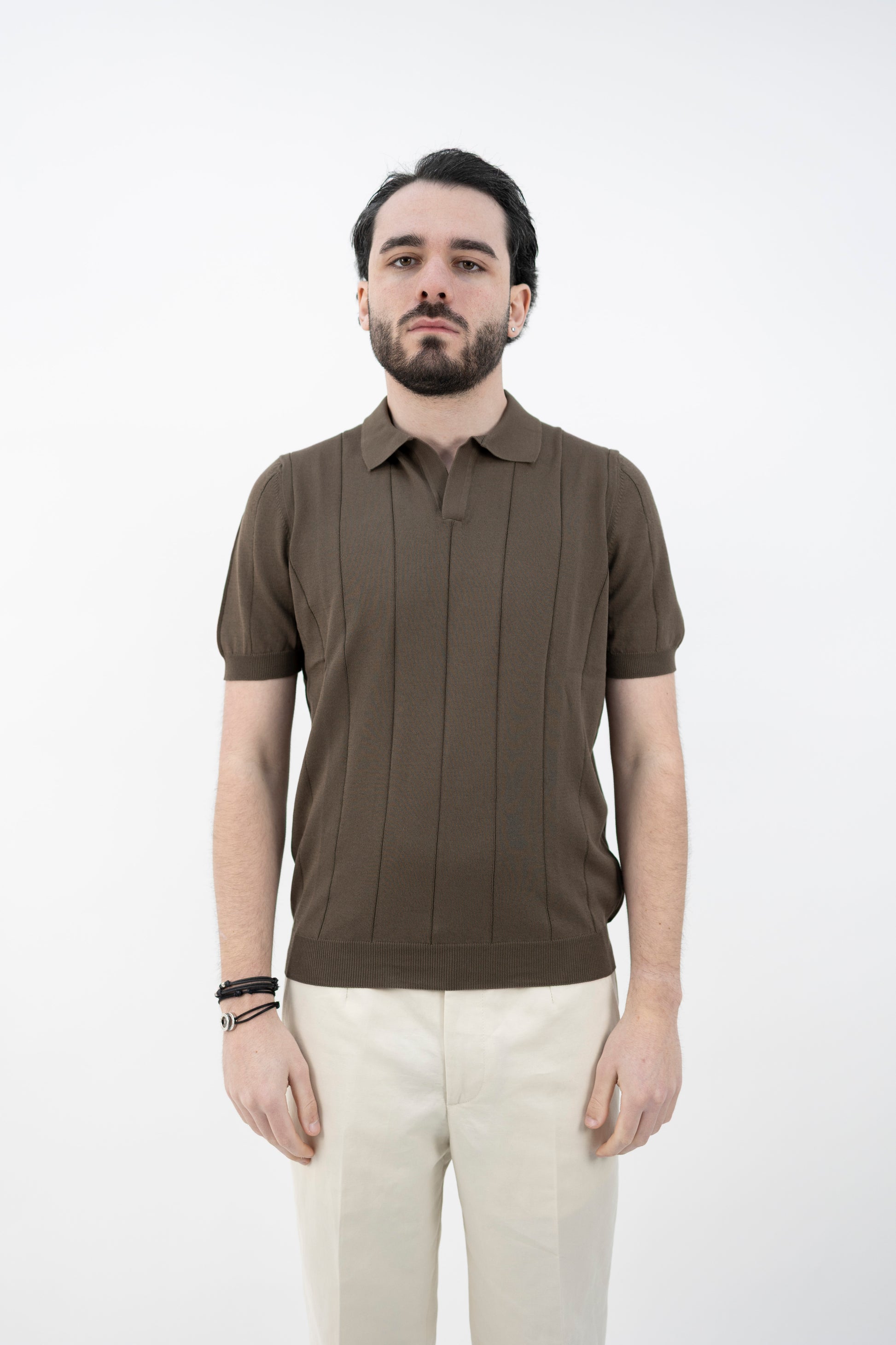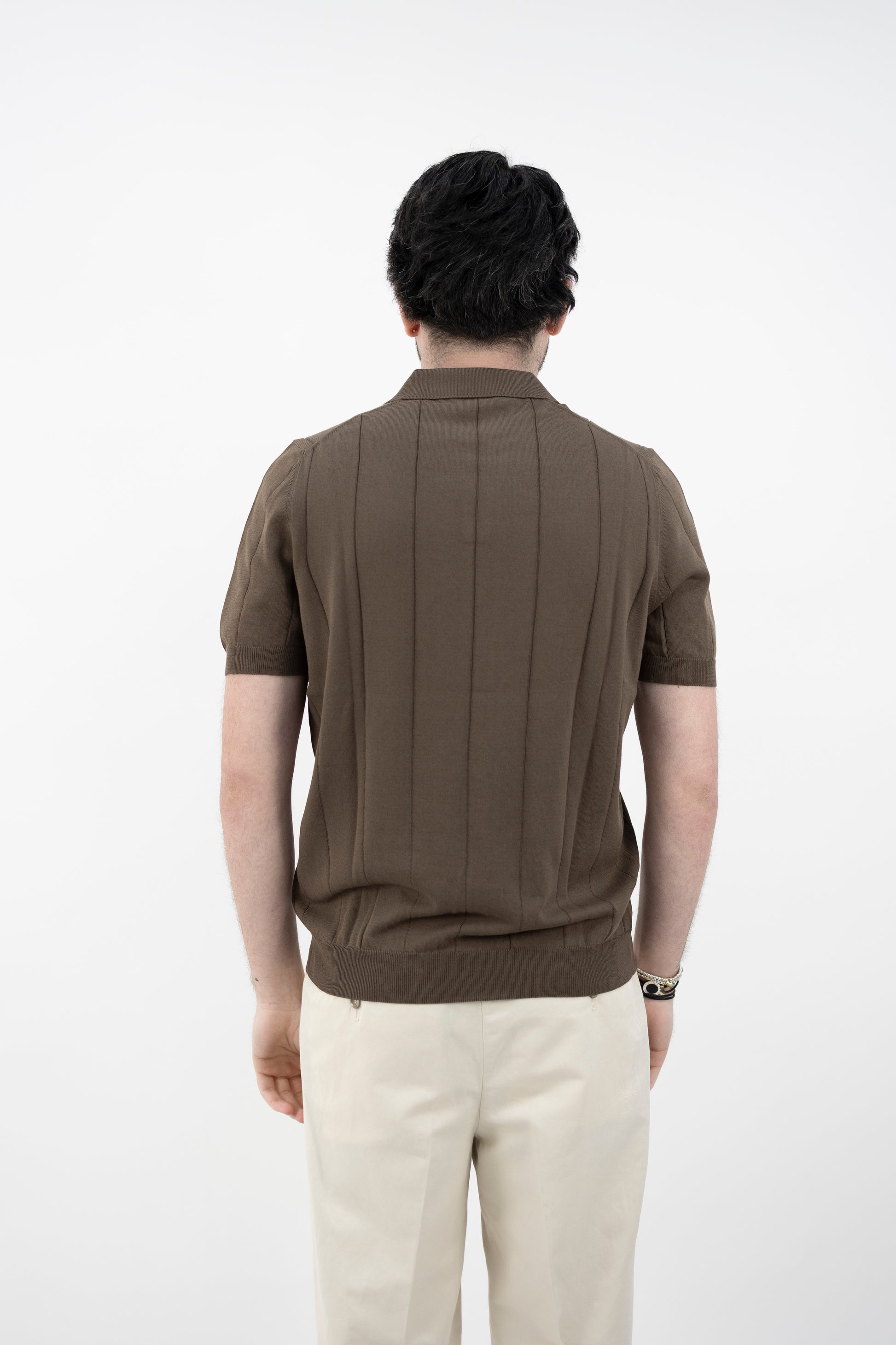 Polo skipper realizzata in Fresh Cotton. Lavorazione a coste verticali, mezza manica con fine manica e fine maglia a costine.