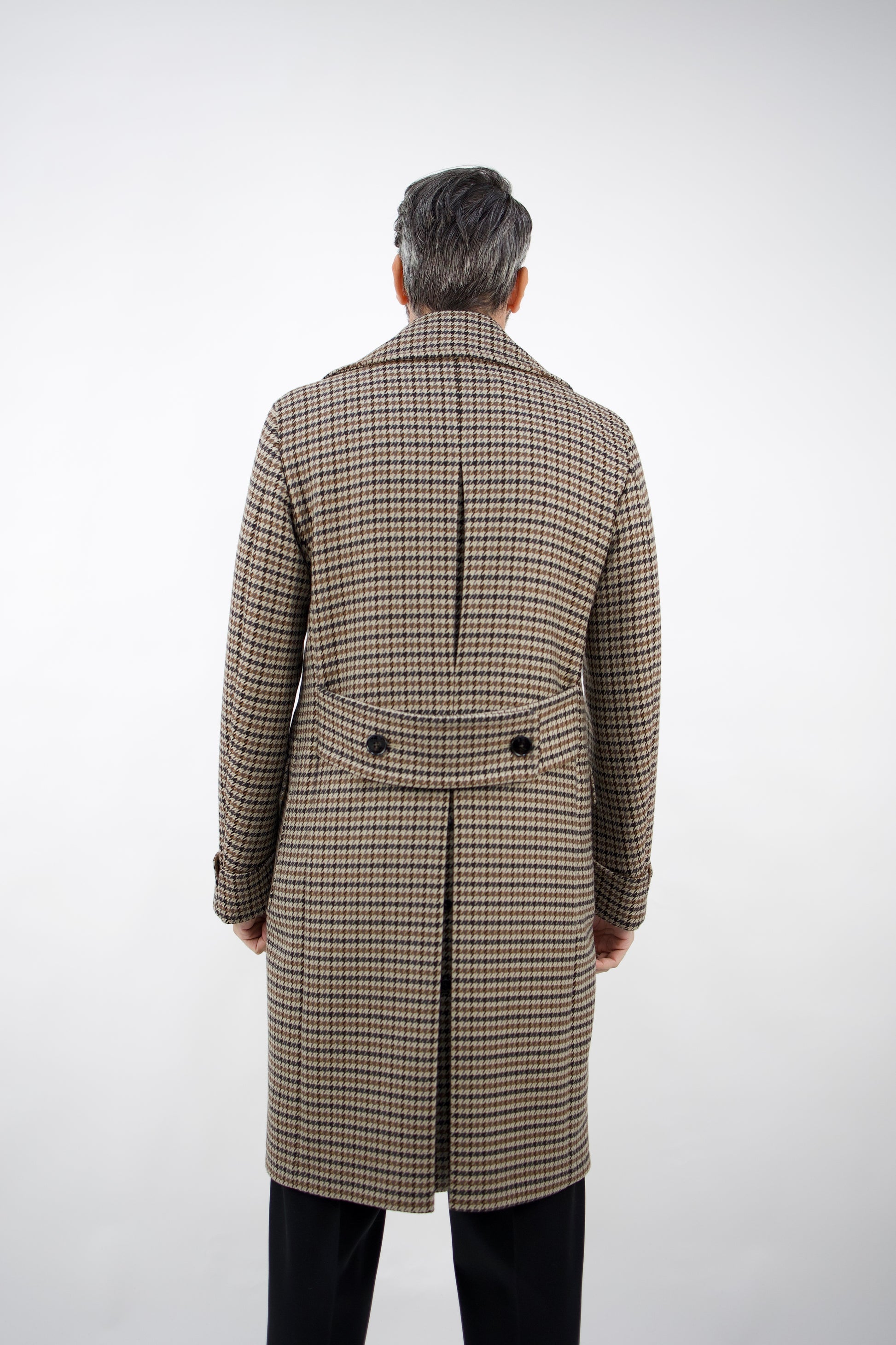 Cappotto foderato doppiopetto Ulster in lana pied de poule, ampio rever, tasche applicate con pattina, martingala, soffietto, bottoni in osso smaltati con logo.