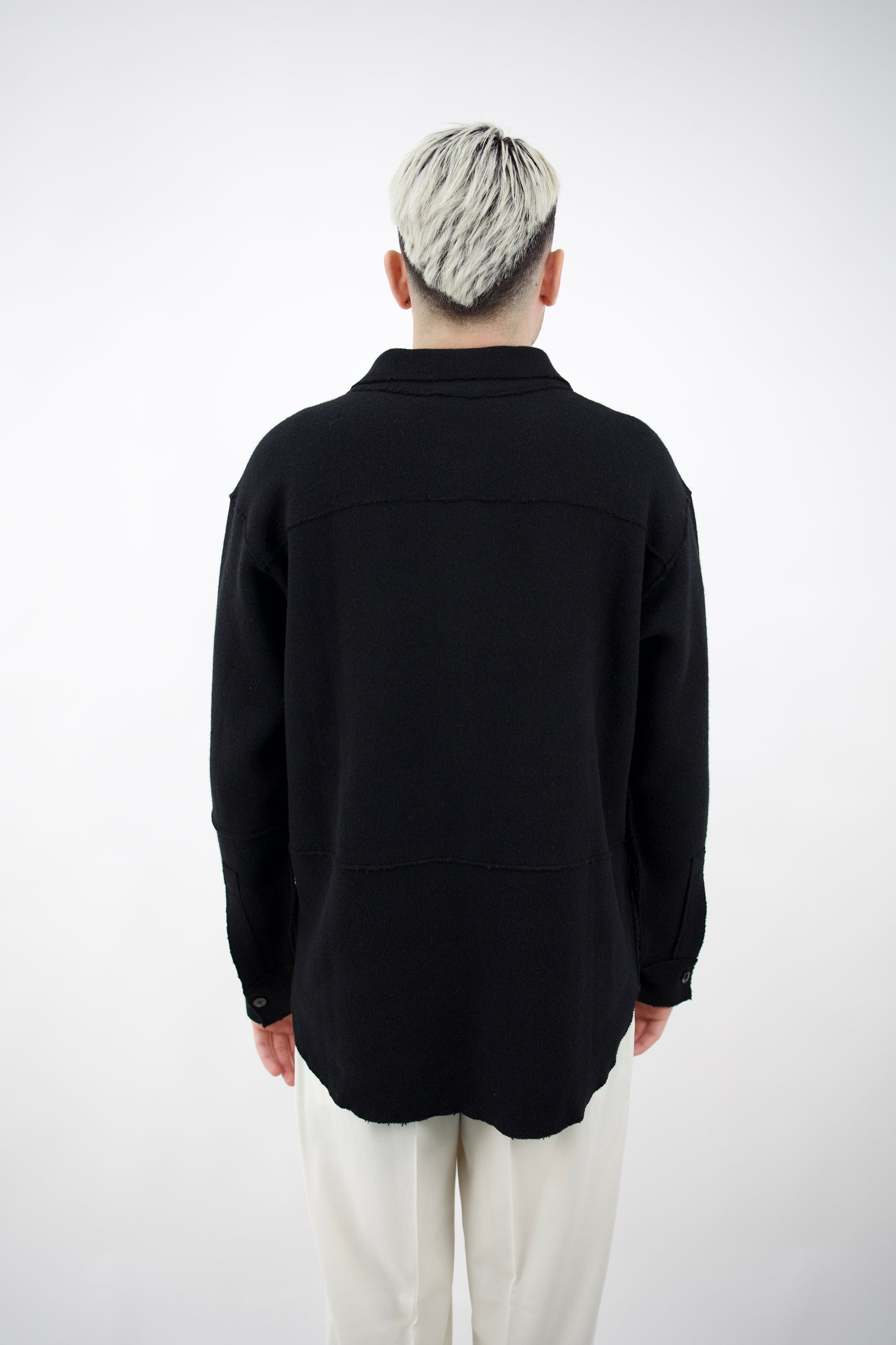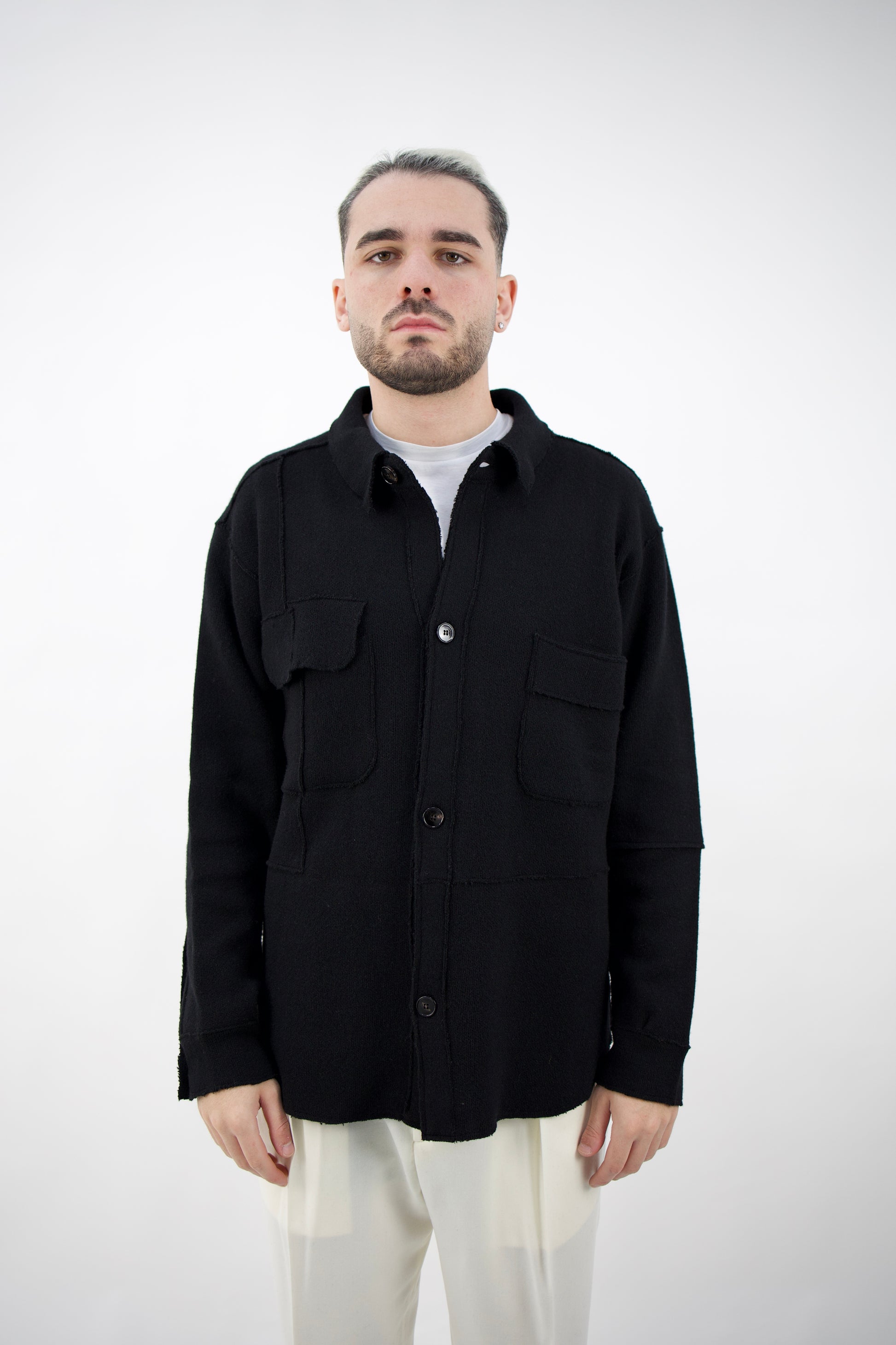 Cardigan con colletto a camicia, chiusura frontale con bottoni due tasche frontali, polsini con bottoni.