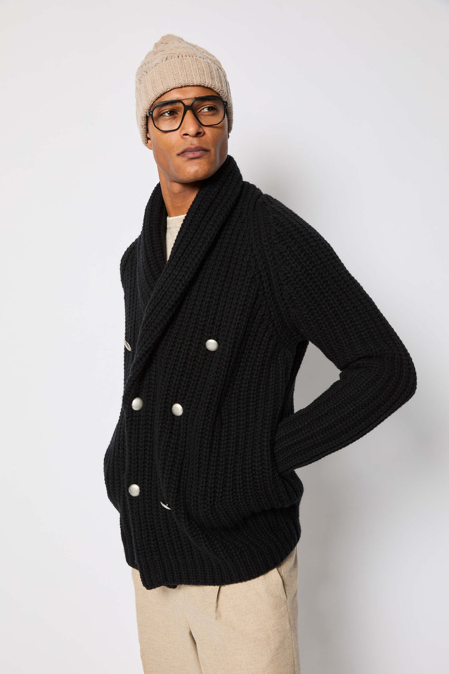 Cardigan doppiopetto con collo a scialle in maglia grossa a coste nero. Presenta doppie tasche laterali ed è impreziosito da 6 bottoni color argento satinato. Questo cardigan, estremamente morbido e caldo può avere una duplice funzione: come capospalla se indossato a vista nella stagione autunnale o sotto a un cappotto per le giornate più fredde.