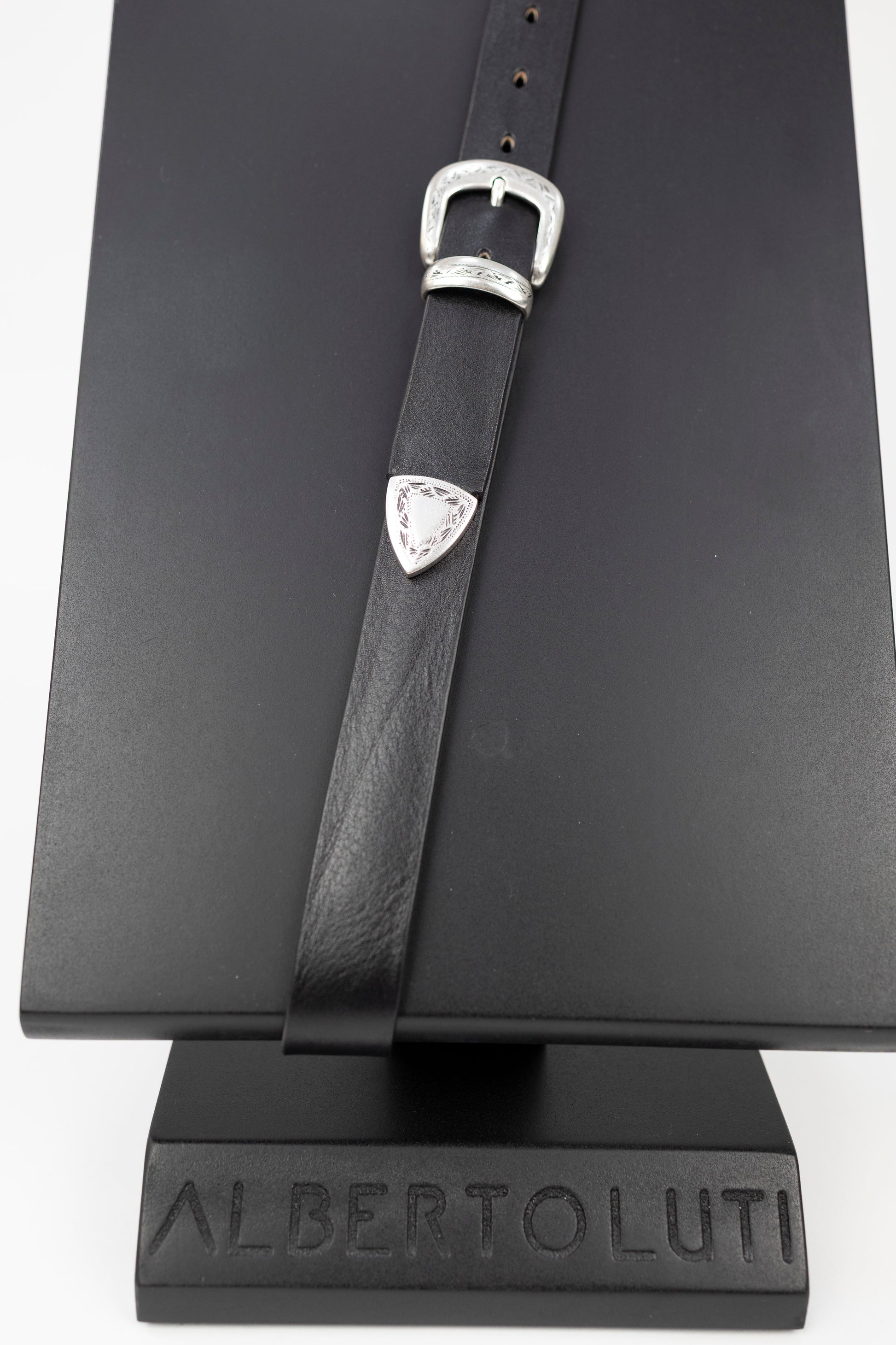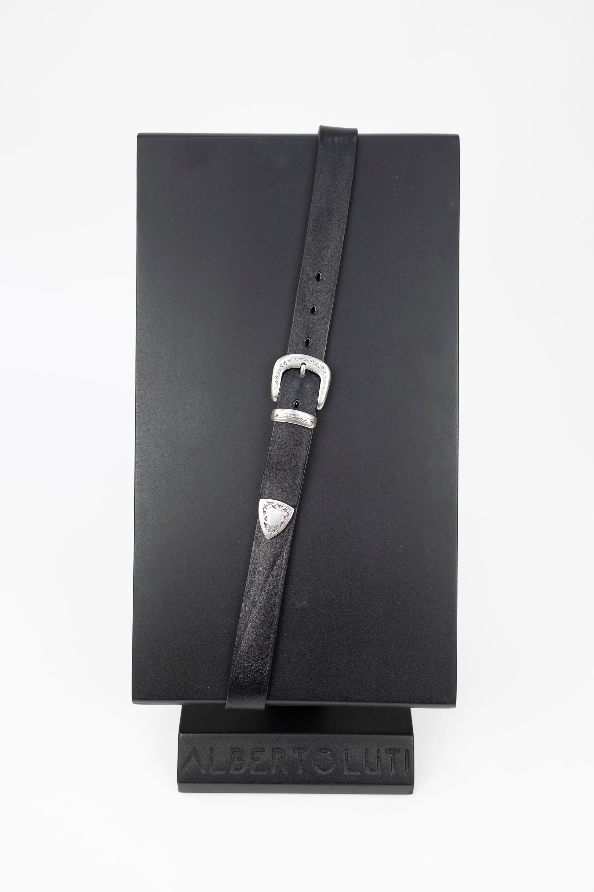 Cintura alta 3 cm in vera pelle. Trittico con finitura argentato.
