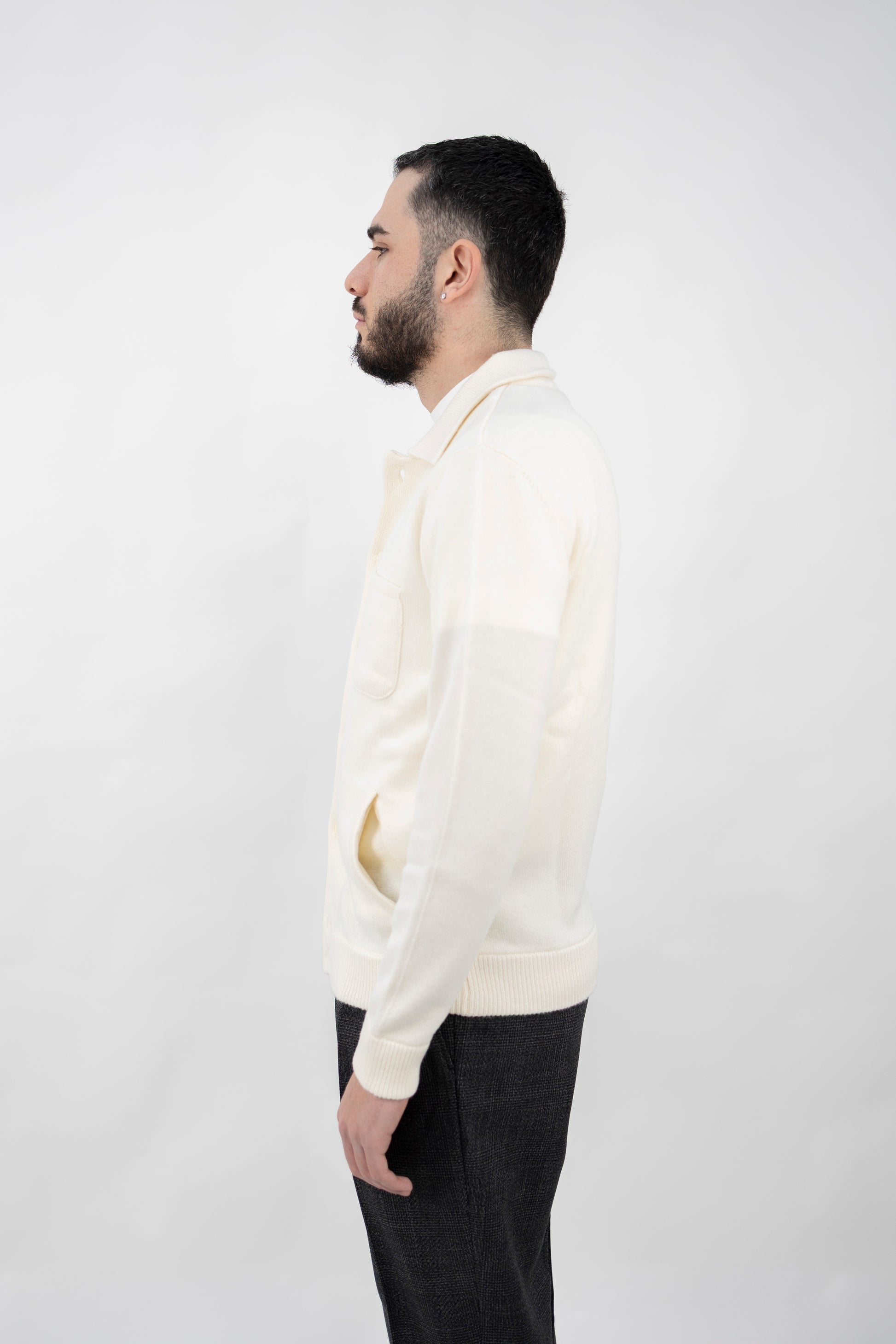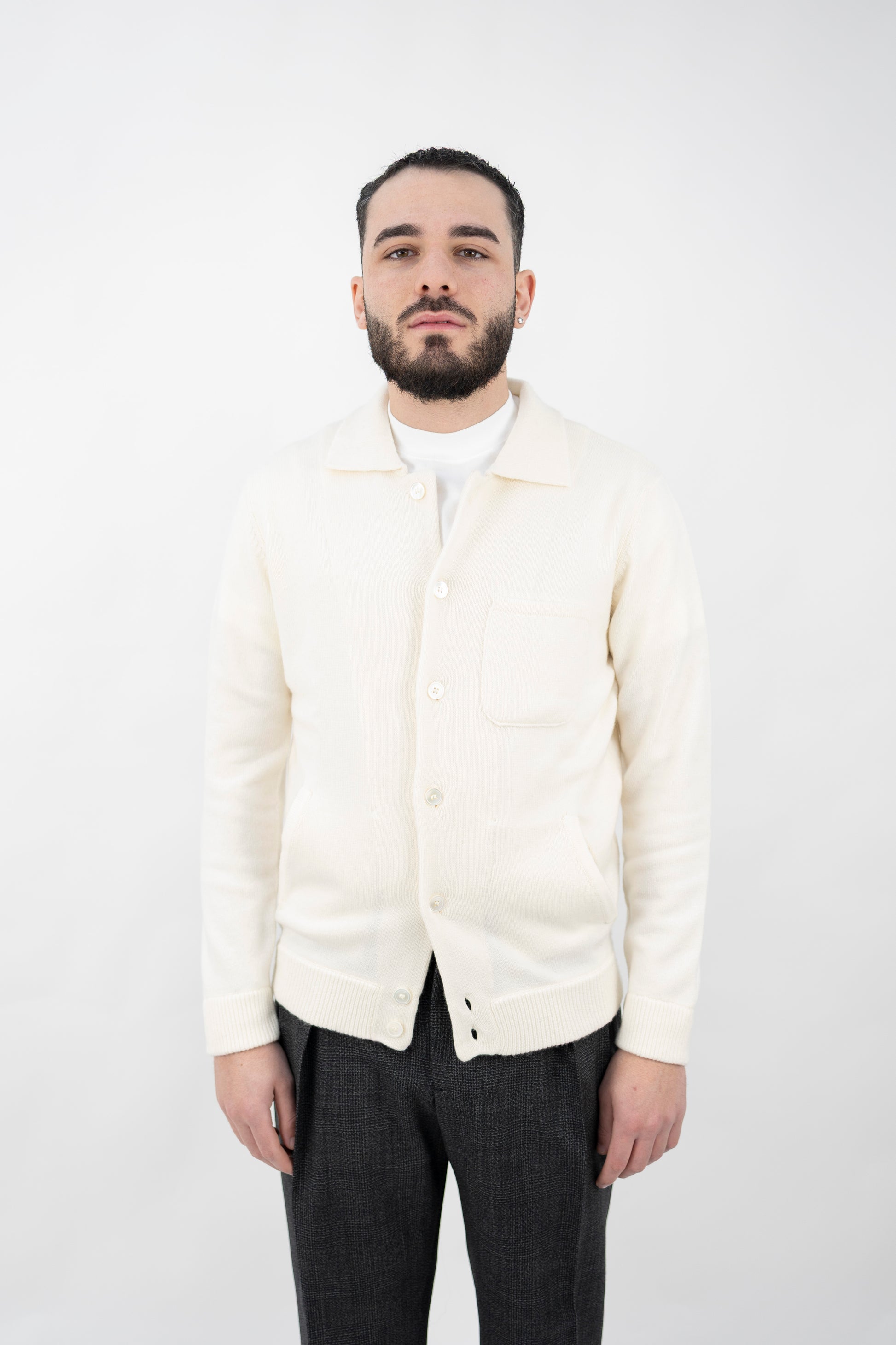 Cardigan realizzato in un pregiato mix di Lana e Cashmere. Collo a camicia, chiusura frontale con bottoni, tasca applicata sul petto, due tasche laterali a filo. fondo manica e fondo maglia a costine.
