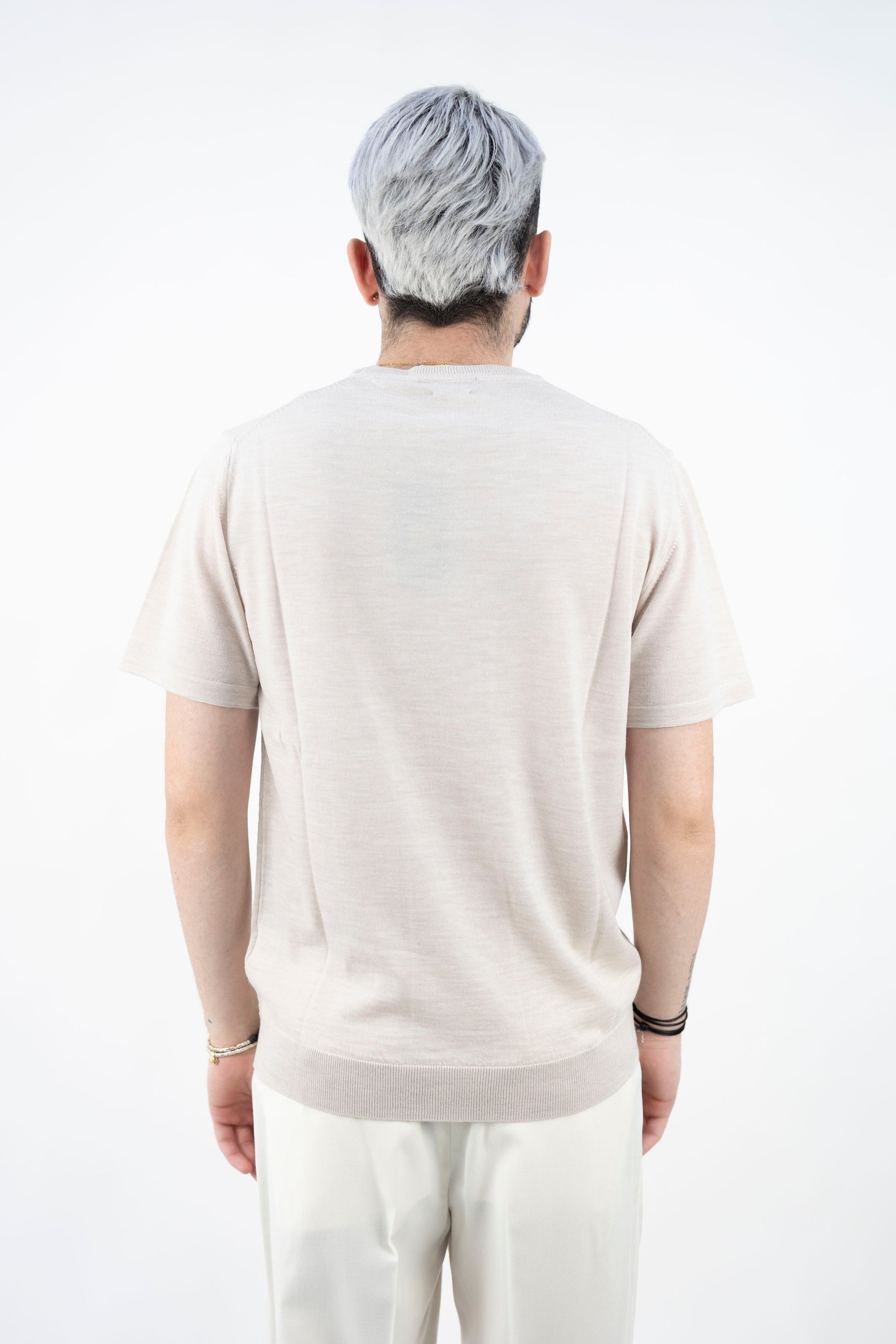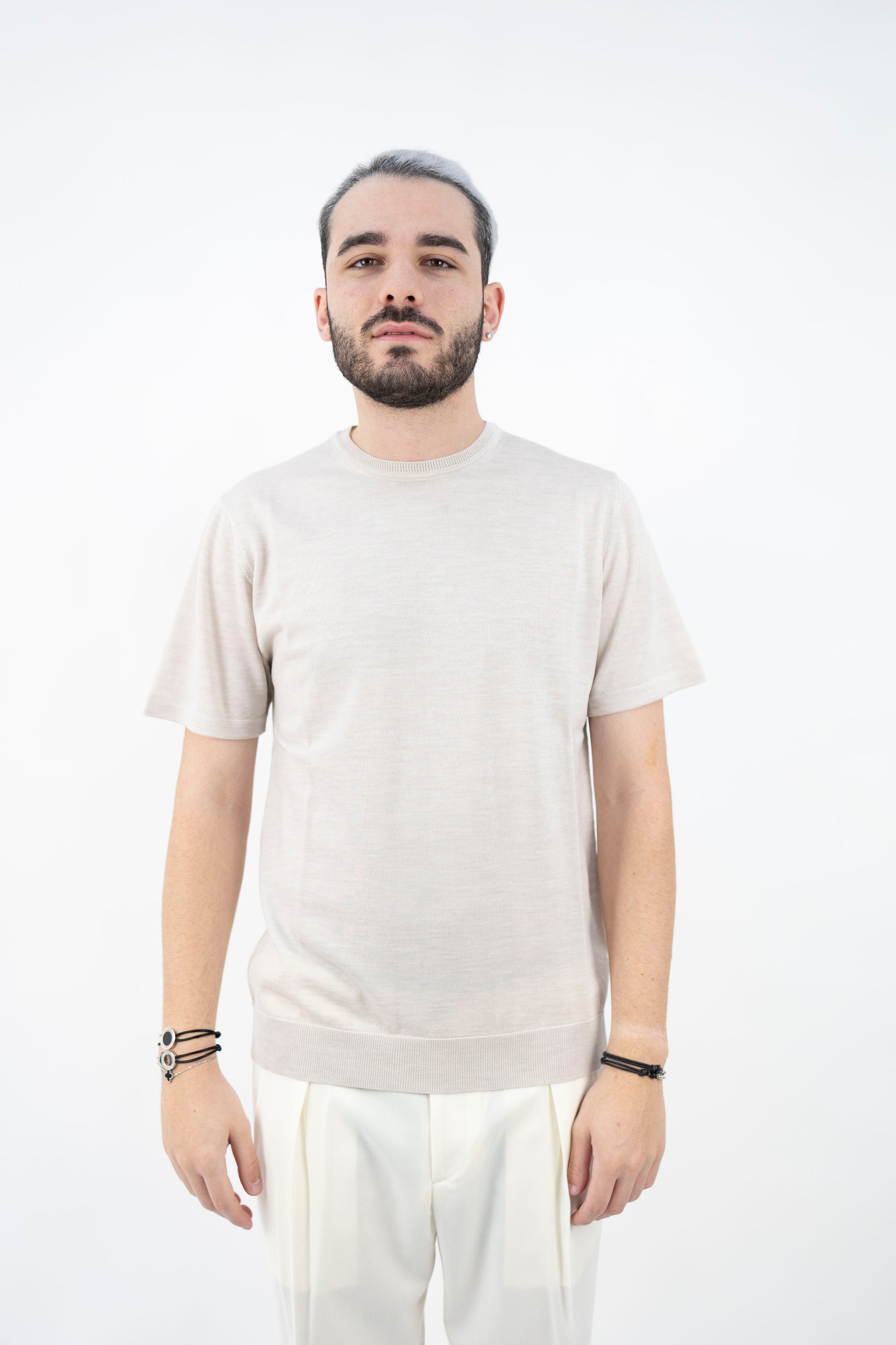 Girocollo mezza manica realizzato in 100% lana merinos extrafine. Fondo maglia con coulisse.