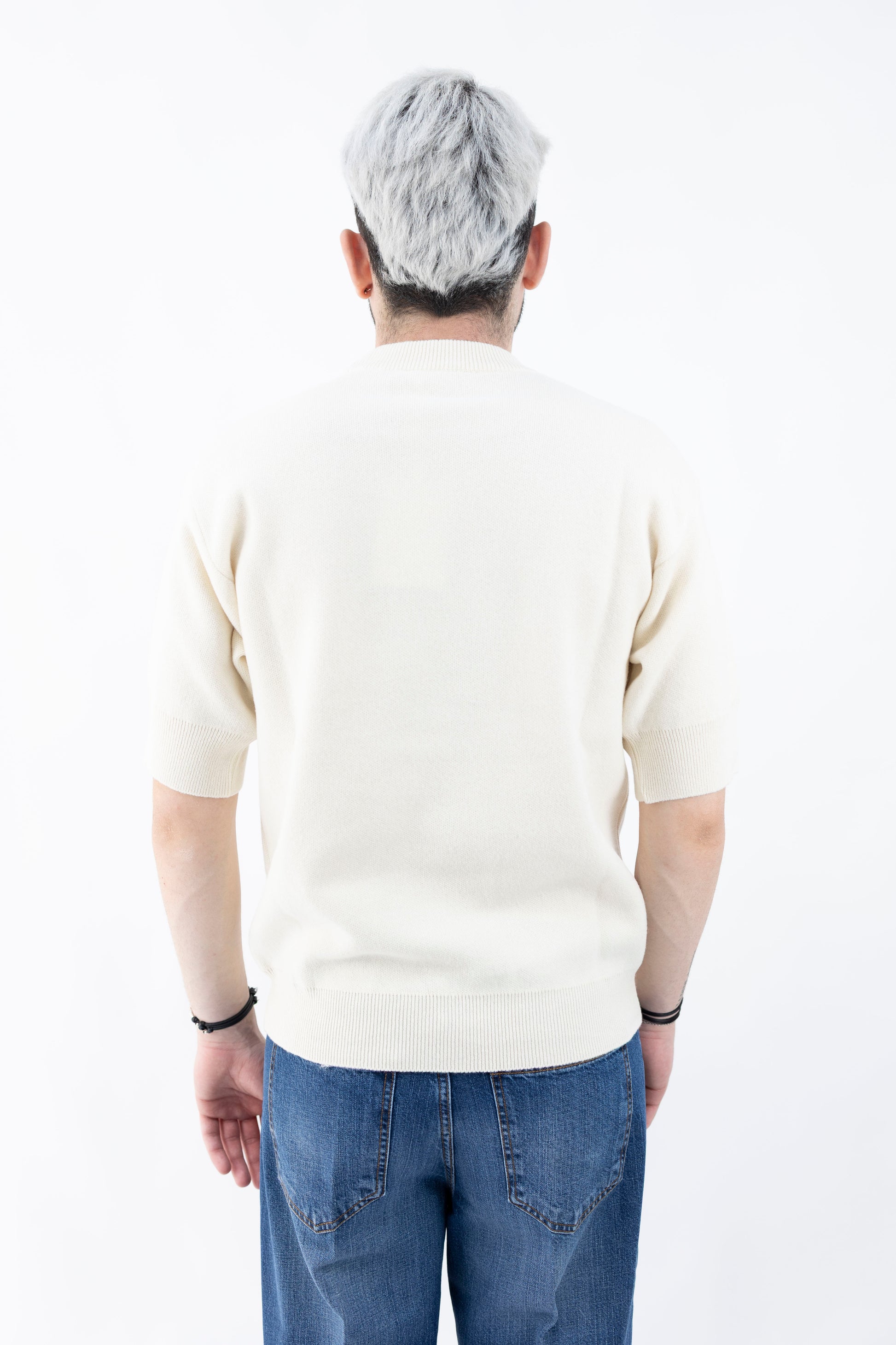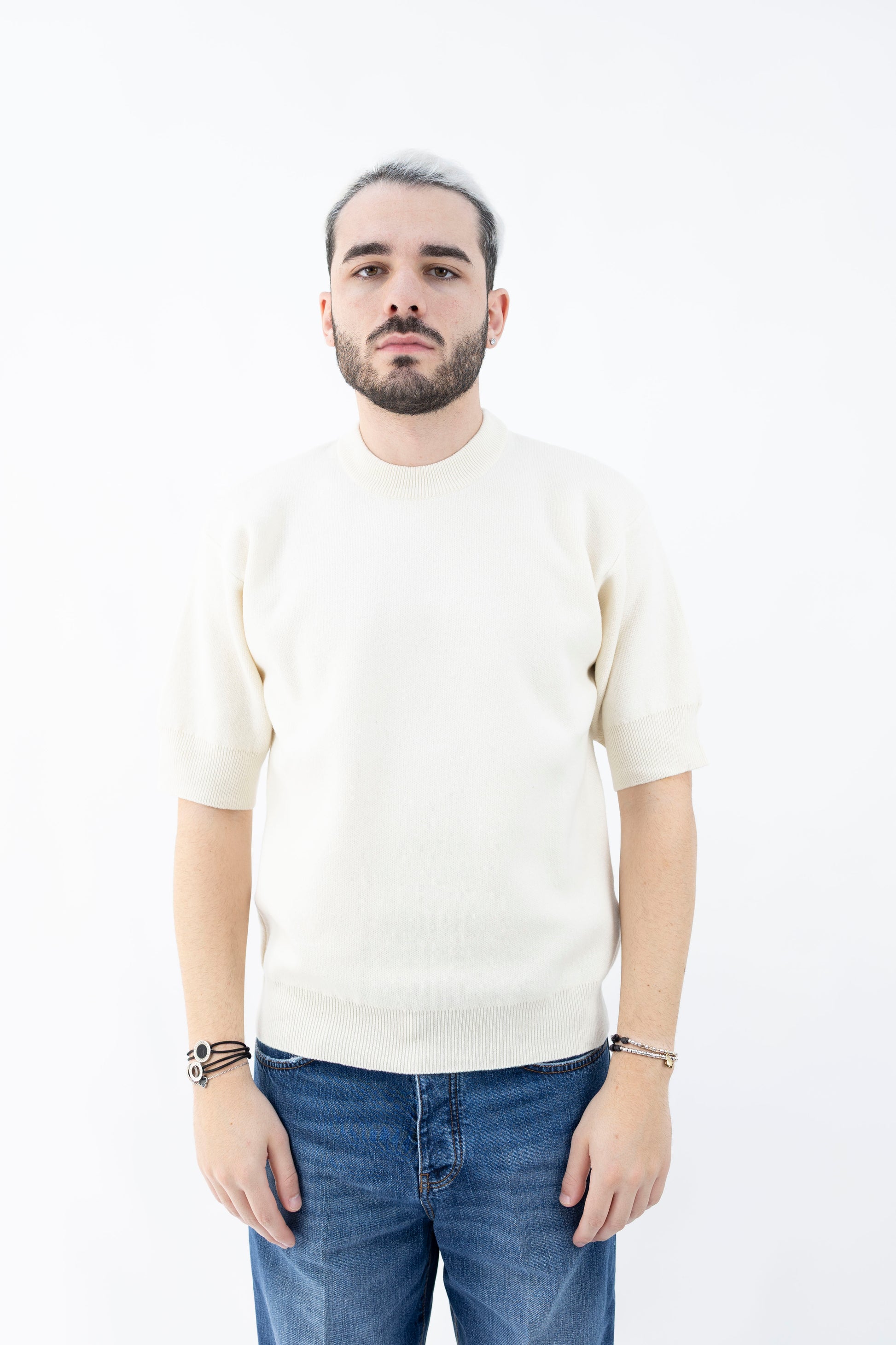 Girocollo in lana e cashmere. Mezza manica, vestibilità over, elastico fondo e polsi.