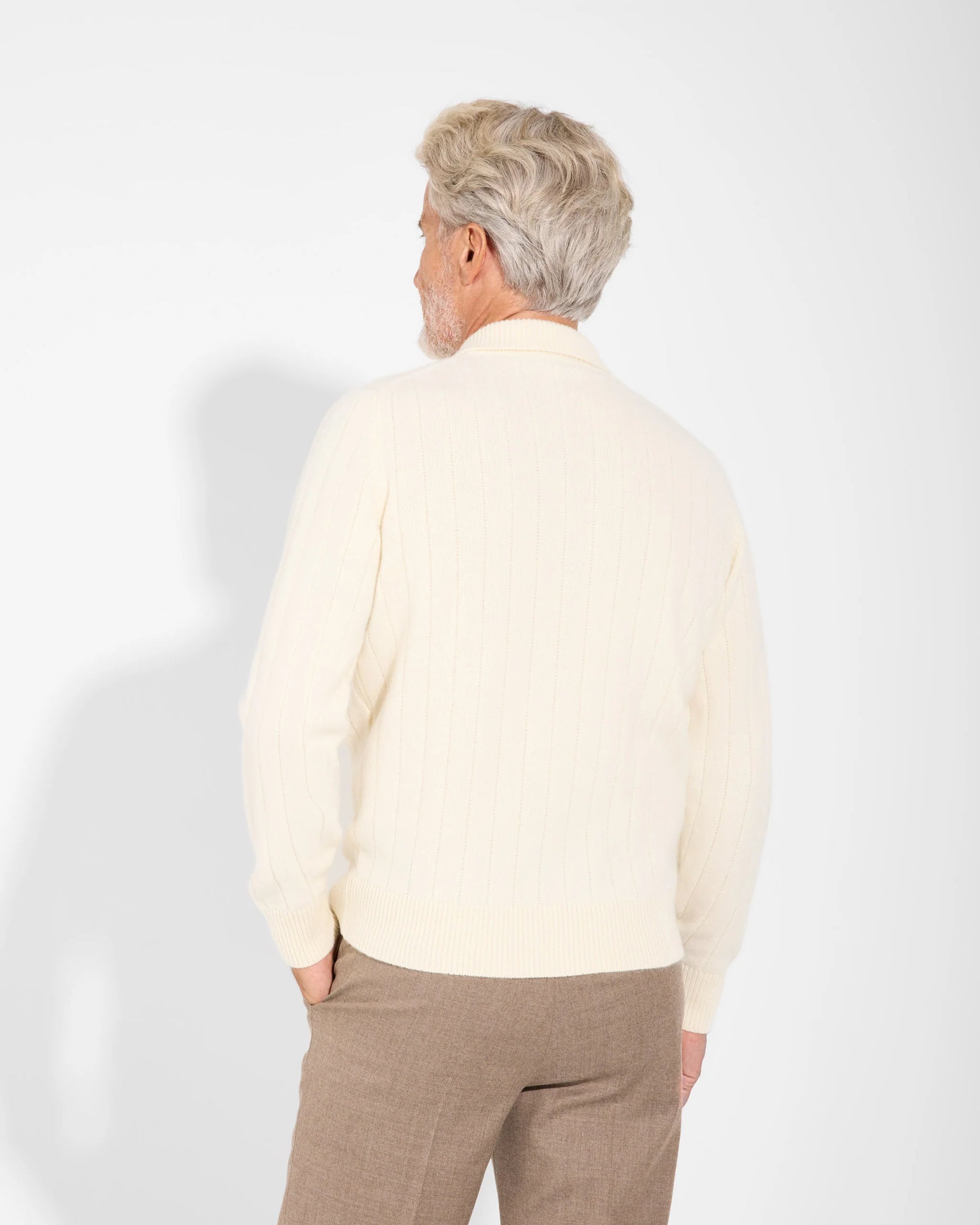 Maglia full zip con collo a polo con lavorazione a coste, realizzato in un lussuoso filato di lana e cashmere. Chiusura con zip doppio cursore. Polsini e fondo maglia a costine.