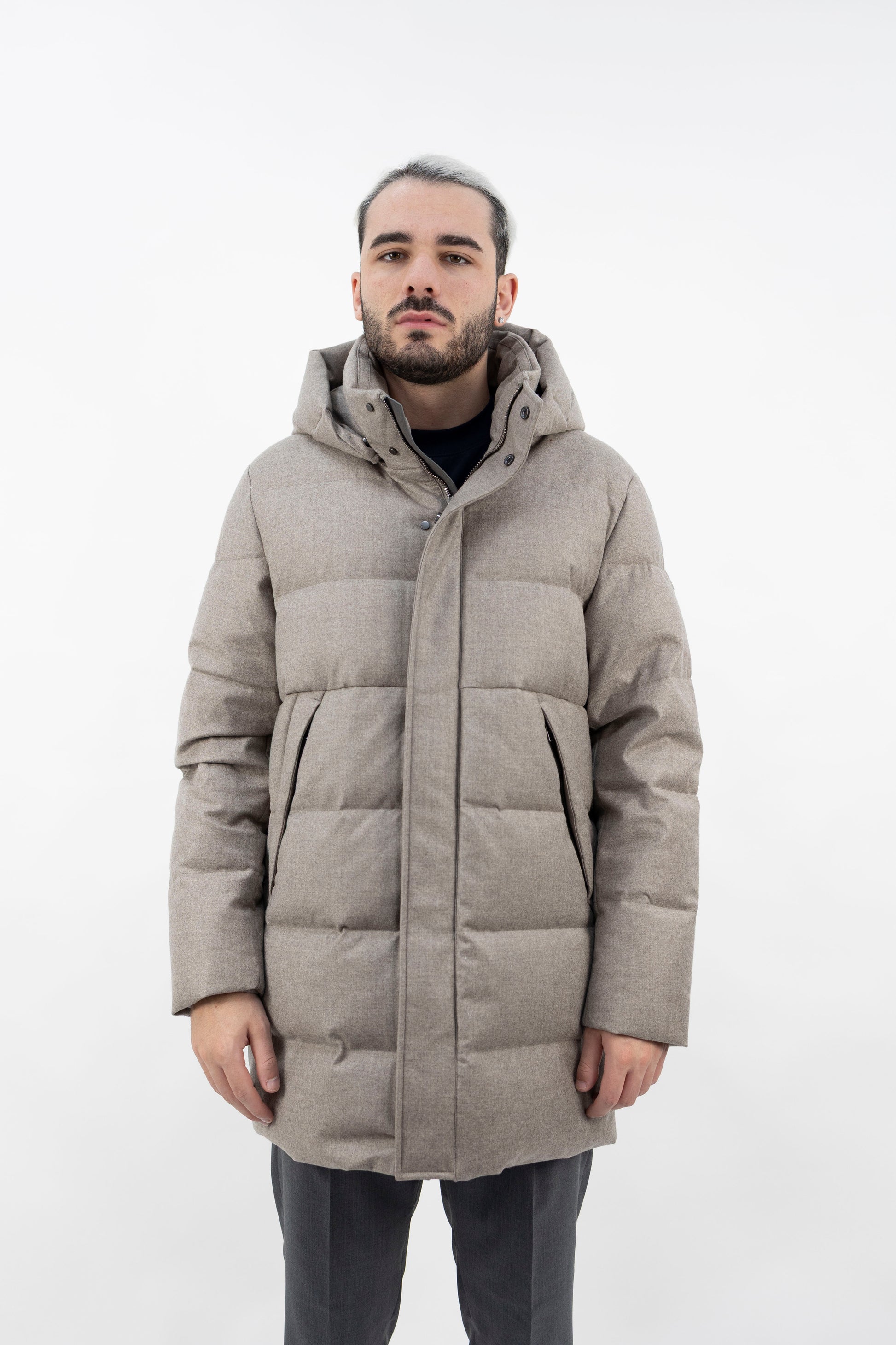 Tessuto Loro Piana di altissima qualità, consistente 1n una mischia preziosa di lane vergini pregiate e cashmere: la lana apporta igroscopicità e termo-regolazione mentre il cashmere dona morbidezza e calore. Il tessuto è arricchito dal trattamento brevettato Storm System® di Loro Piana, consistente in un finissaggio sulla superficie brevettato Rain System® di Loro Piana che lo protegge dal vento e dalla pioggia e da una speciale membrana idrofila GO bio-based applicata sul rovescio che garantisce performance water-proof e wind-proof, mantenendo la mano dolce del tessuto. L'imbottitura in piuma completa il sistema protettivo del capo.