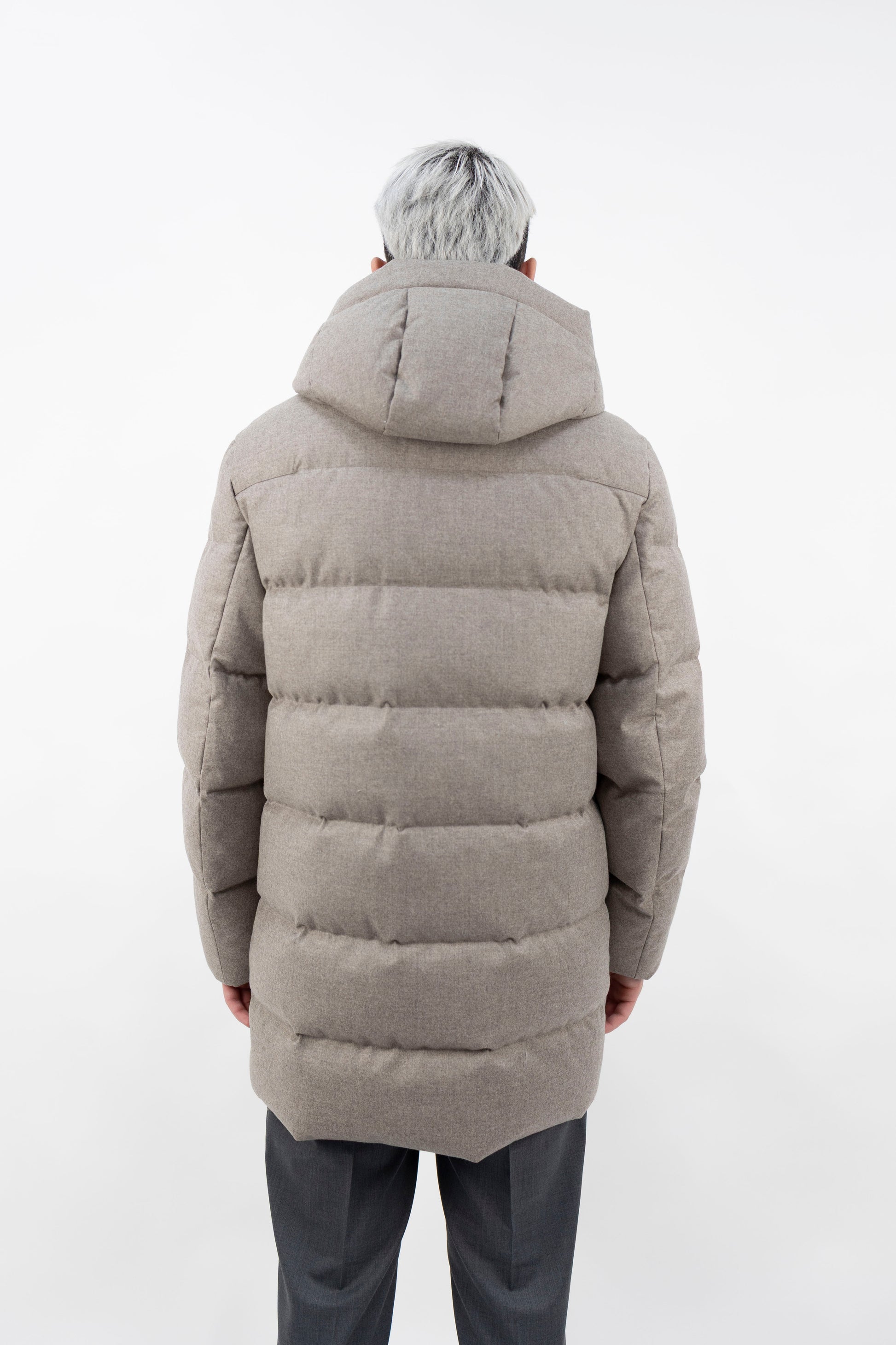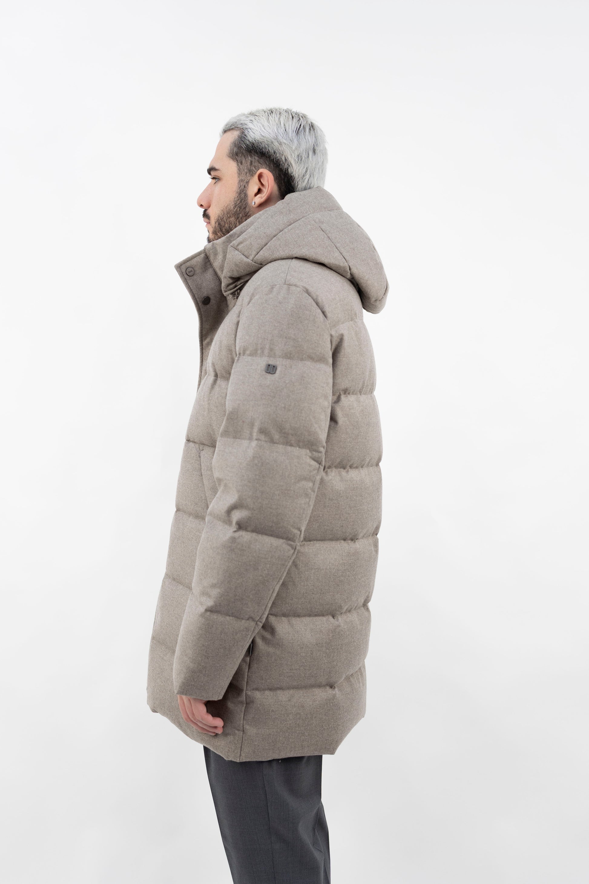 Parka trapuntato in tessuto pregiato di lana e cashmere a marchio LORO PIANA® appartenente al progetto "ATTIC" per il segmento Luxury Garments di DUNO. Il capo è caratterizzato da doppia chiusura frontale con zip metallica doppio cursore ed automatici nascosti, cappuccio staccabile con zip allo scollo esterno e tasche laterali antivento chiuse da zip coperte da filetto. Il trattamento brevettato STORM SYSTEM® garantisce performance waterproof e windproof. La morbidezza e il calore del tessuto sono enfatizzati dall' imbottitura in piuma che, con i polsini interni in costina di lana, completa il sistema protettivo del capo. All' interno labeling dedicato al tema "ATTIC" e tasche con chiusura a zip.