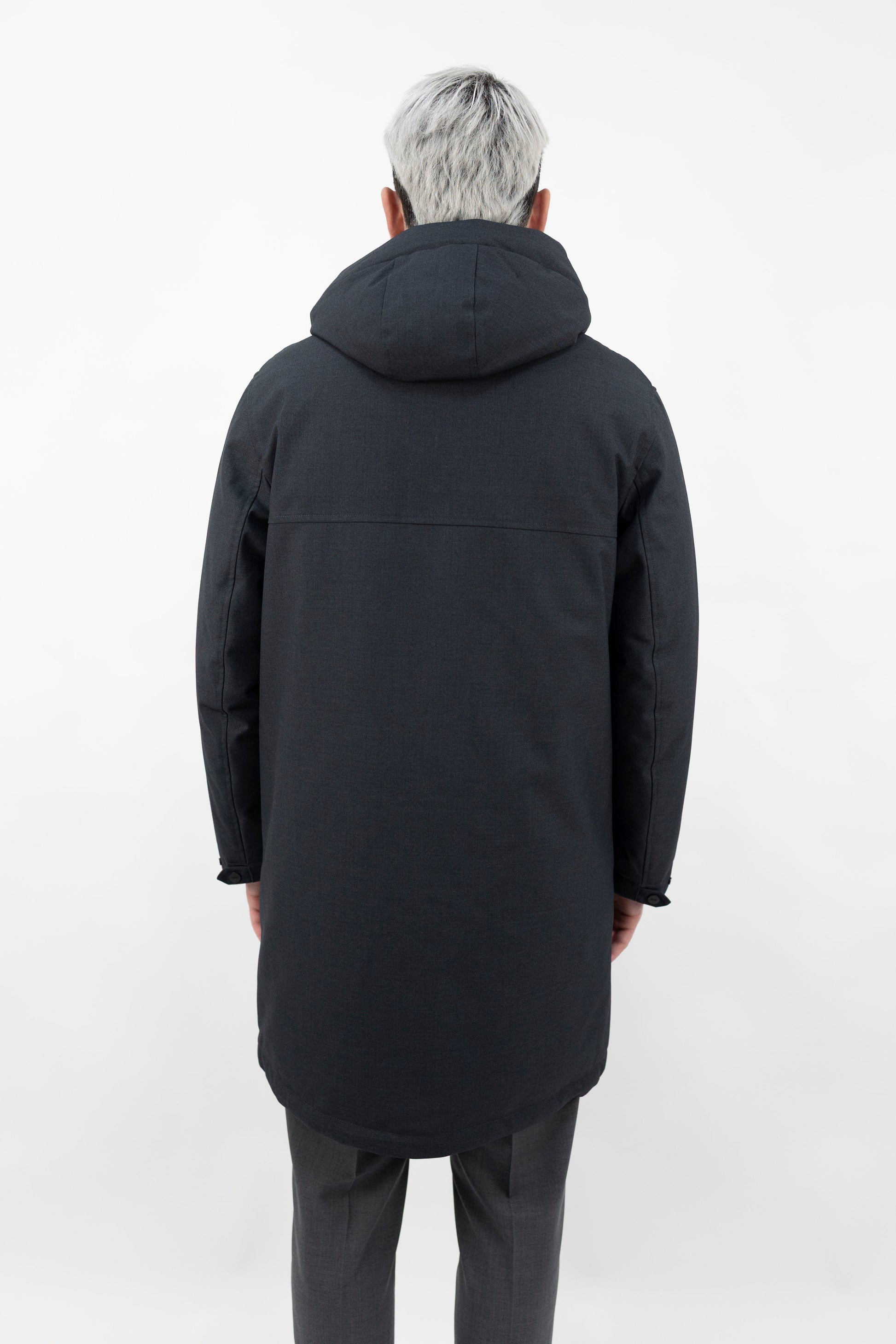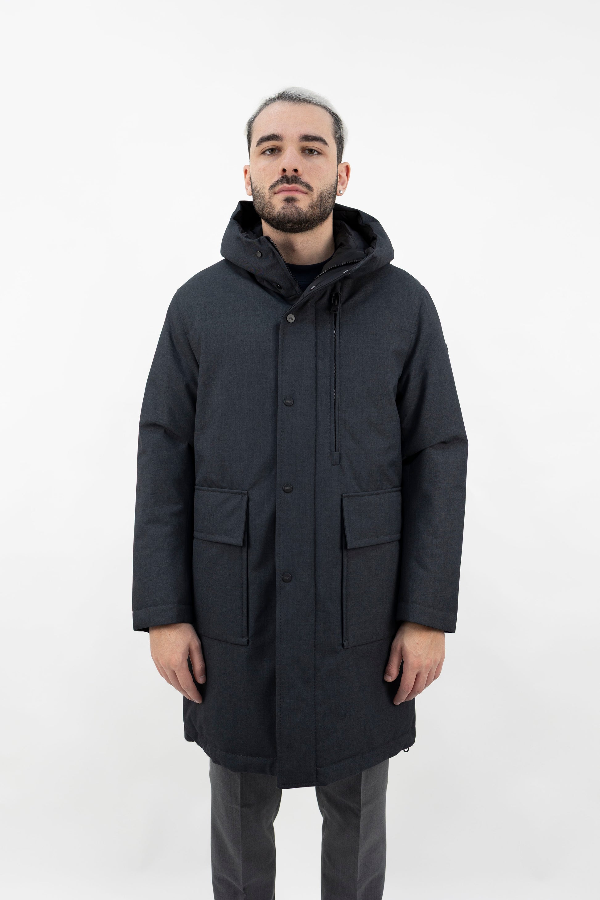 Parka reversibile in tessuto 3-Layer di aspetto laniero con imbottitura in piuma. Il capo è caratterizzato da ampio cappuccio, doppia chiusura frontale con zip doppio cursore ed automatici a vista e soluzione multi-pocket: tasca al petto con zip nascosta da doppio filetto ed ampie tasche laterali a toppa con pattina chiusa da automatici nascosti. Polsino regolabile con laccio ed automatico. All'interno piumino in tessuto tecnico superlight con zip doppio cursore, tasche laterali a filetto con zip e coulisse al fondo.