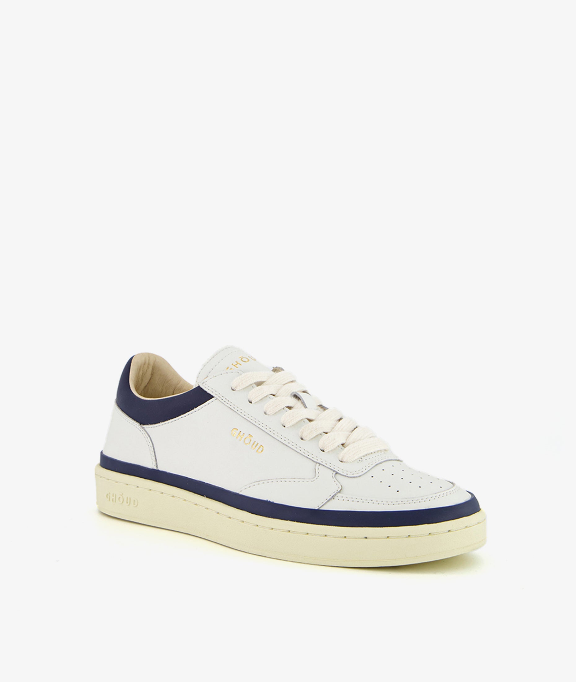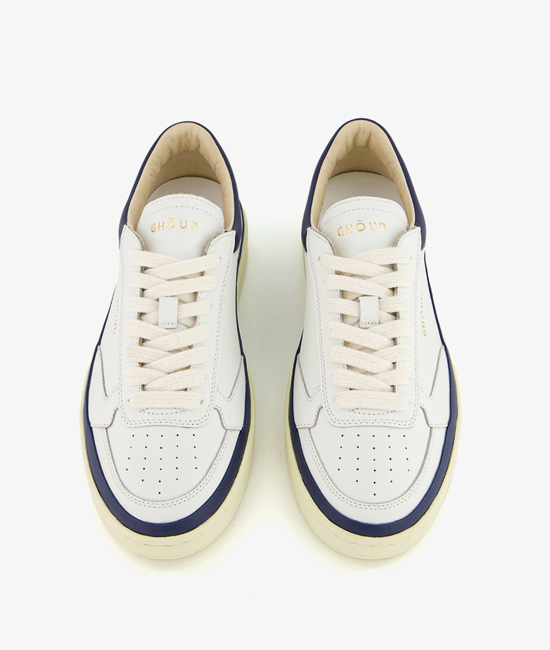 Sneakers Pads, l'ultima creazione di Ghōud che celebra l'essenza del design contemporaneo. La silhouette elegante presenta una tomaia in morbida pelle bianca con dettagli di colore blu, impreziosita da una termosaldatura di precisione, lungo la suola, che ridefinisce il concetto di minimalismo.