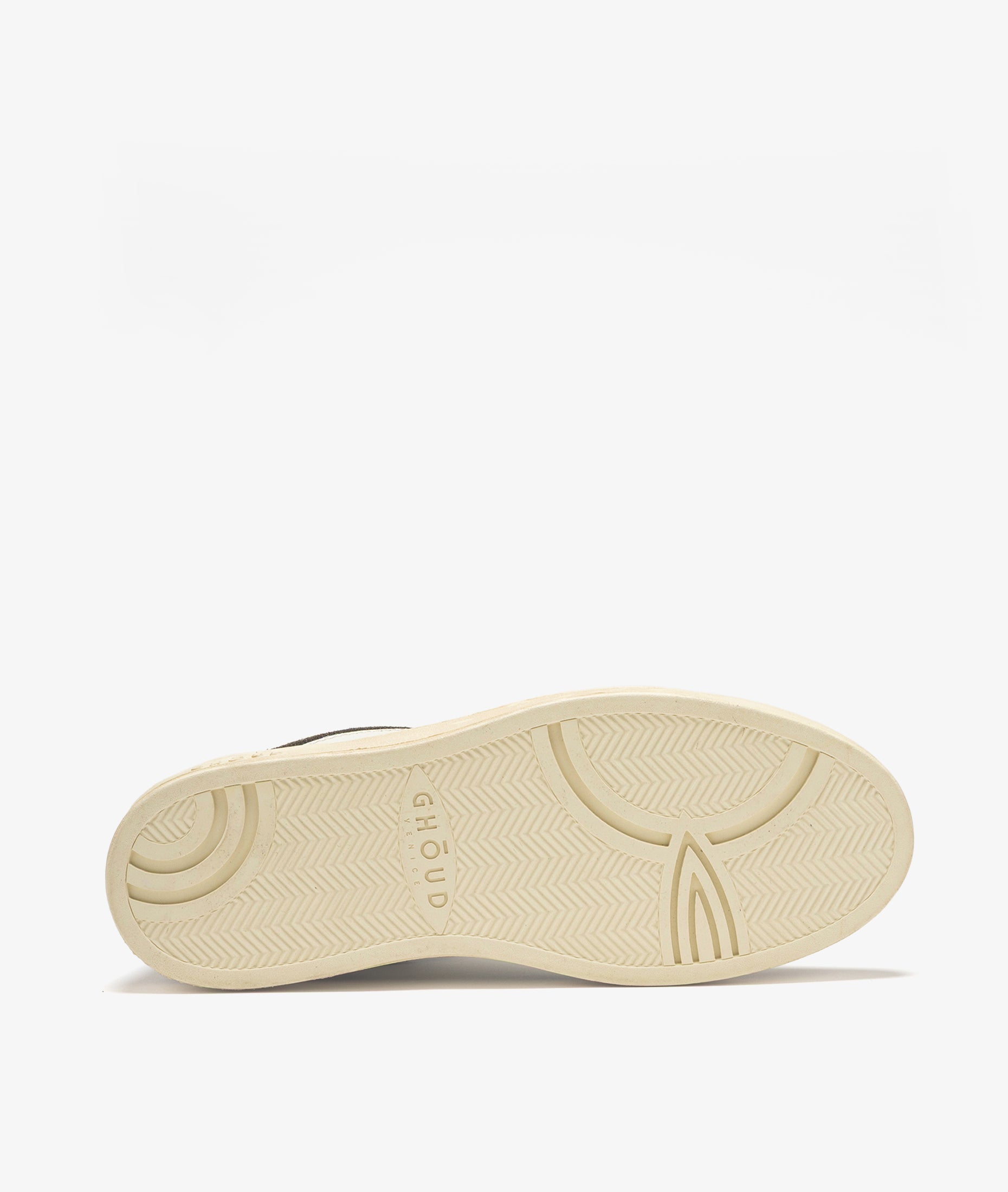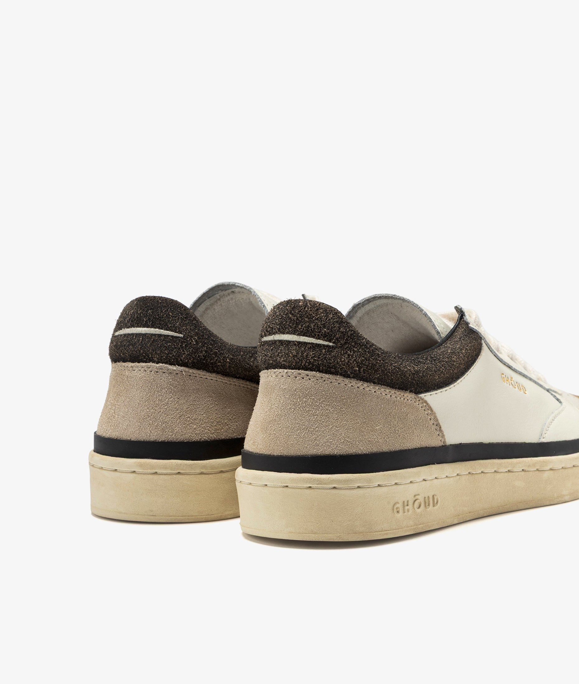 Sneakers Pads, l'ultima creazione di Ghōud che celebra l'essenza del design contemporaneo. Realizzate in morbida pelle bianca, presentano un tallone con effetto screpolato per un accento texturizzato e una termosaldatura continua lungo la suola per un'estetica pulita e moderna. Impreziosite da un processo di invecchiamento manuale.