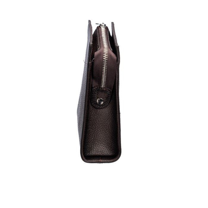 Pochette realizzata in Pelle di Cervo tamponata e sfumata a mano, chiusura con cursore in argento, logo applicato sul davanti ,interno con 2 scomparti di cui uno con cerniera, altezza 21cm - profondità 8 cm - larghezza 27cm.