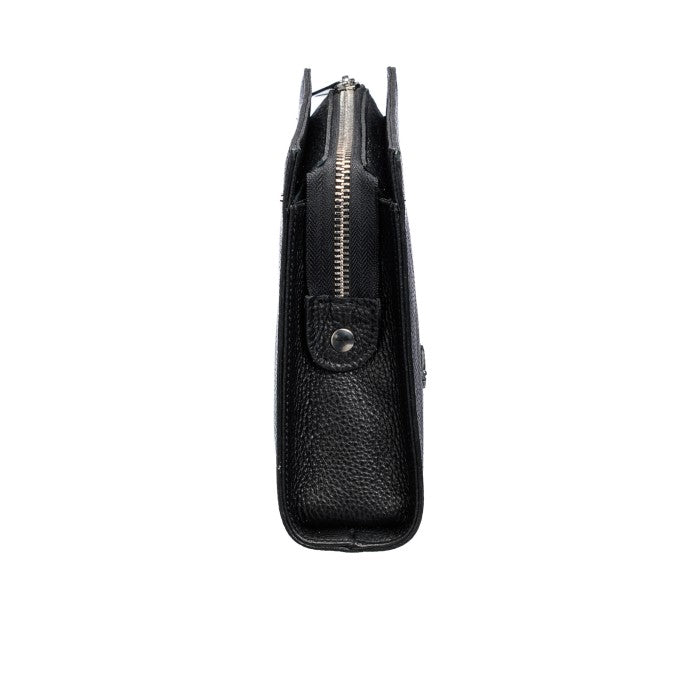 Pochette realizzata in Pelle di Cervo tamponata e sfumata a mano, chiusura con cursore in argento, logo applicato sul davanti ,interno con 2 scomparti di cui uno con cerniera, altezza 21cm - profondità 8 cm - larghezza 27cm.