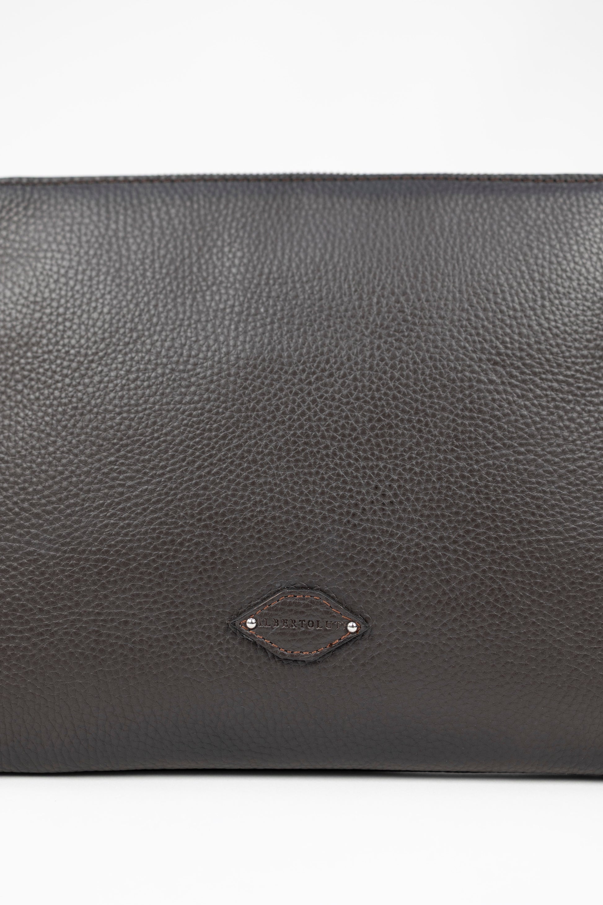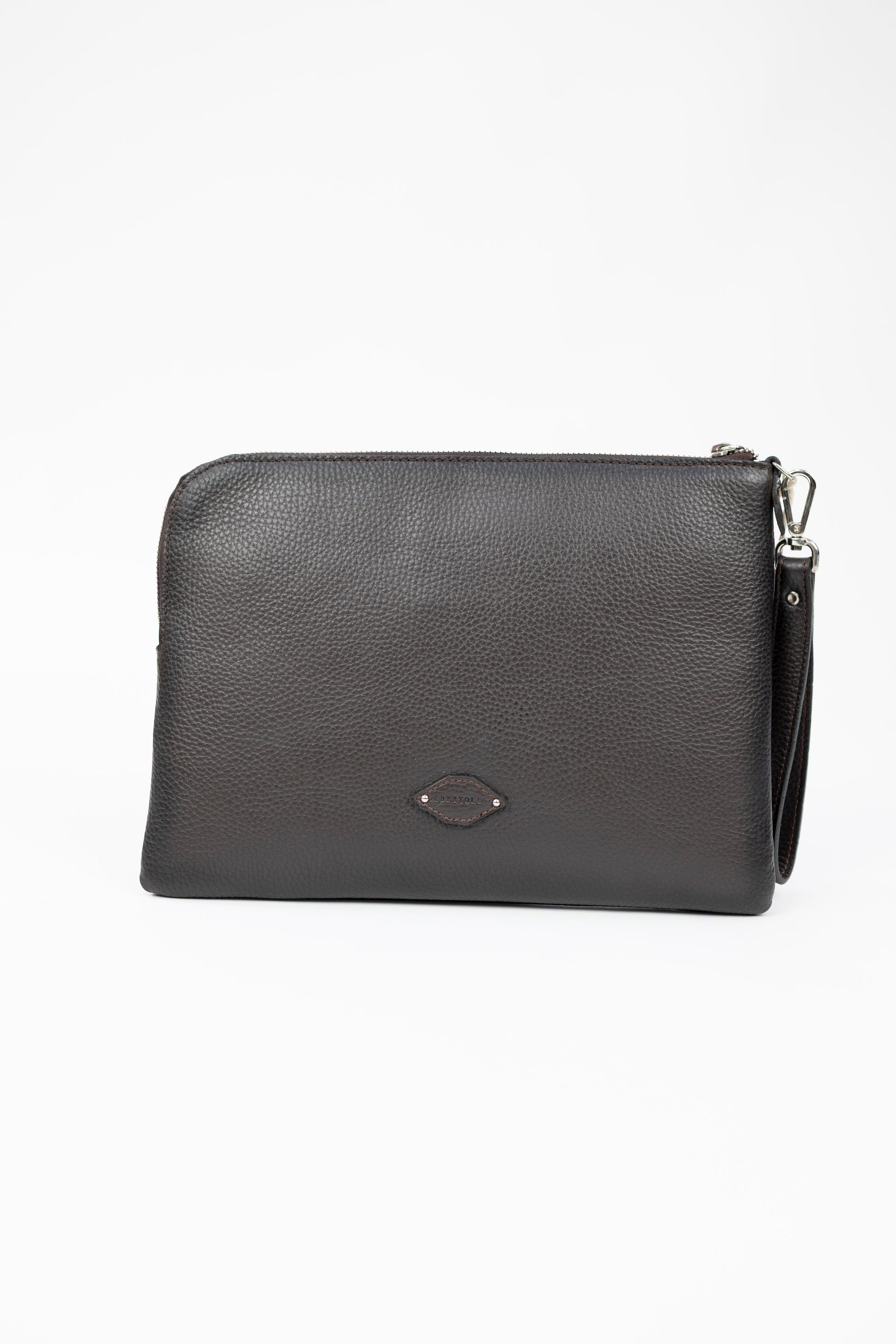 Pochette realizzata in Pelle di Cervo tamponata e sfumata a mano, chiusura con cursore in argento, logo applicato sul davanti ,interno con 2 scomparti, manico estraibile, altezza 22 cm - profondità 2 cm - larghezza 31 cm.