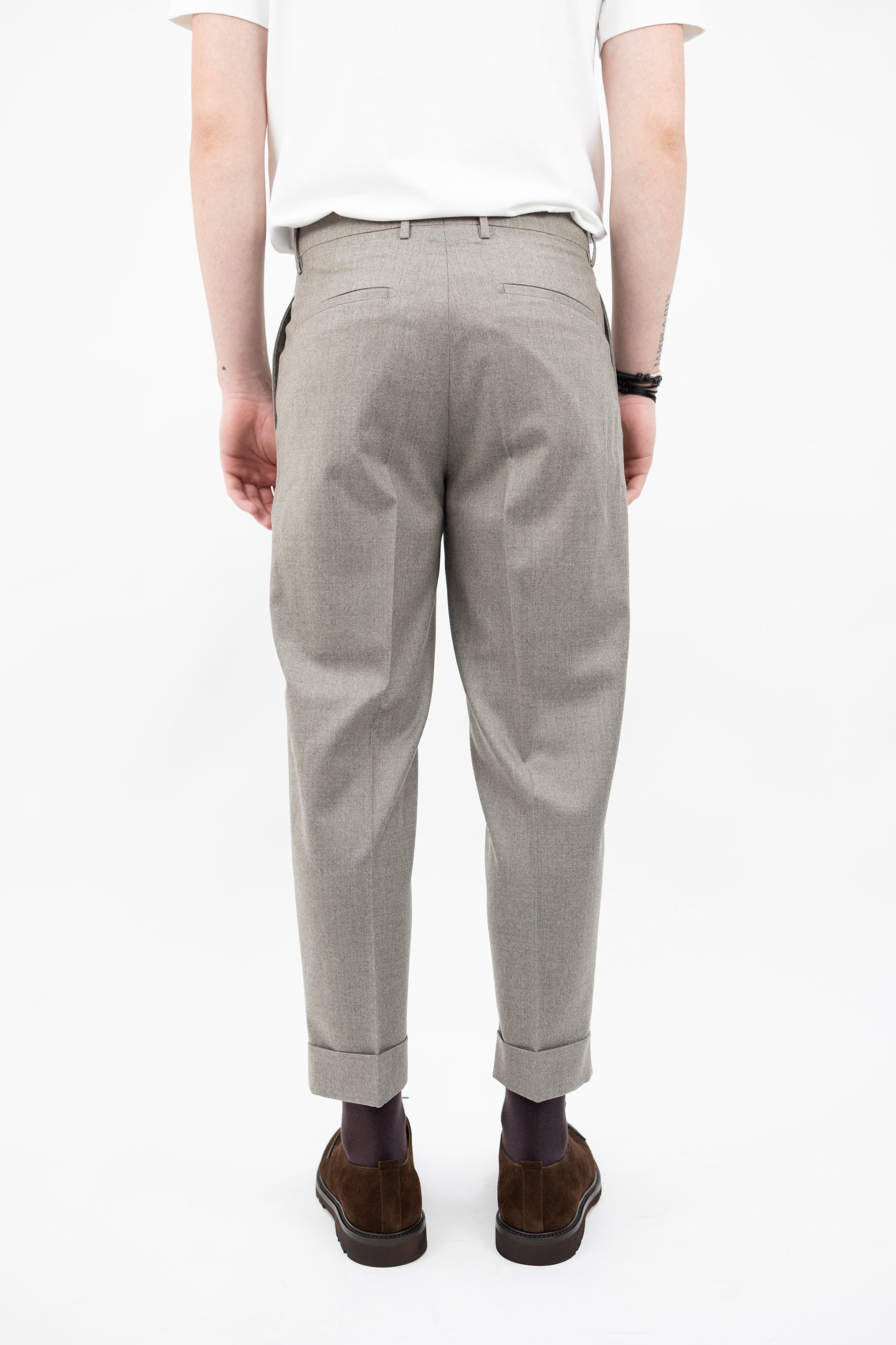 Pantalone Chiaia tessuto in lana pregiata Vitale Barberis plain flanelight . Chiusura in vita con cerniera e doppio bottone, passanti per cintura, pence sul davanti, tasche a filo sul fianco e tasche a filo sul retro, fondo con risvolto 5 cm , cavallo morbido fondo 18 cm.